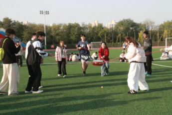 各项比赛中,学生精神抖擞、全力以赴,尽显青春风采与奋进姿态。“n人n+1足”赛道上,参赛队员肩挽肩、手牵手,展现了出色的团队协作水平。在“众星捧月”环节,八名队员围绕鼓面默契配合,每一次平稳颠球都引来全场阵阵欢呼。“踩气球”项目将现场氛围推向高潮,参赛者身手敏捷、应变灵活,攻防之间尽显实力。各班级学生在比拼中互帮互助,在竞争中携手共进,充分彰显了他们奋勇争先、团结友善的精神风貌。