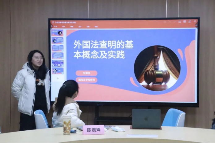 张羽佳以“外国法查明的基本概念及实践”为主题,系统阐述了外国法查明的定义、依据和途径,结合具体的法律条文为学生详细解释了人民法院查明外国法的途径。她给大家介绍了西北政法大学中国—中亚法律查明与研究中心,鼓励大家积极撰写文章参与学术对话,在实践中深化对专业知识的理解。