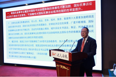 山东省法学会国际法学研究会研究会秘书长、烟台大学法学院副教授朱玲玲主持主旨发言。我校国际法学科带头人、国家智库研究基地西北政法大学涉外法治研究中心执行主任、首席专家王瀚教授和中国政法大学国际法学院博士研究生导师宋连斌教授先后做了主旨发言。王瀚教授做“国际民商事争议解决实践的发展动向与我国涉外法律服务业发展新机遇”的主题发言,分别就当前国际民商事争议解决实践发展趋势、中国法律服务业的国际化转型和发展机遇和涉外法律服务业变革的制度创新三个问题做了内容充实的阐述。