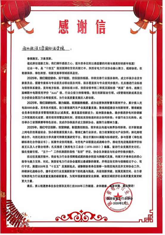 近日,吕江教授团队(吕江、张光耀、王阳、寸雨琳梓、李秀、金瑞昕、胡博文、李咏琪、吴娇杰、廖纬霖、阴依娜)收到陕西省电力行业协会发来的感谢信,对吕江教授团队在协会“电力法律合规题库建设与模拟竞赛服务项目”中提供的技术服务和智力支持表示高度认可和诚挚感谢。