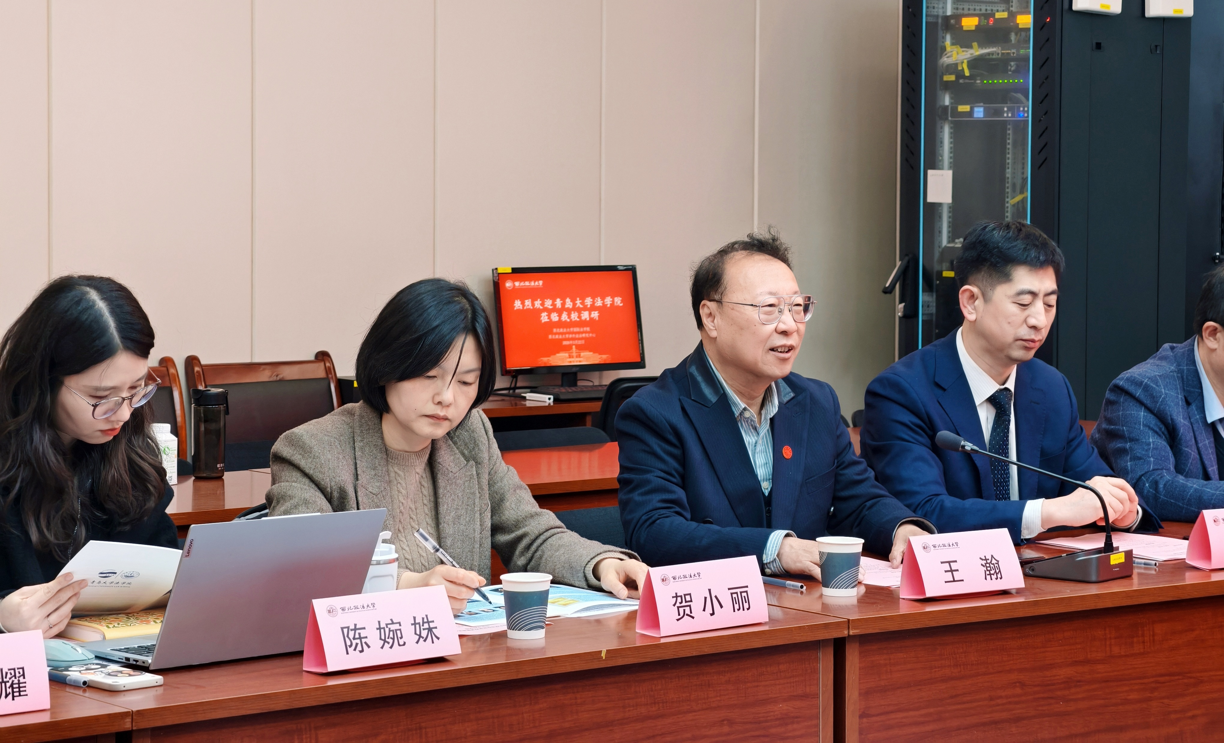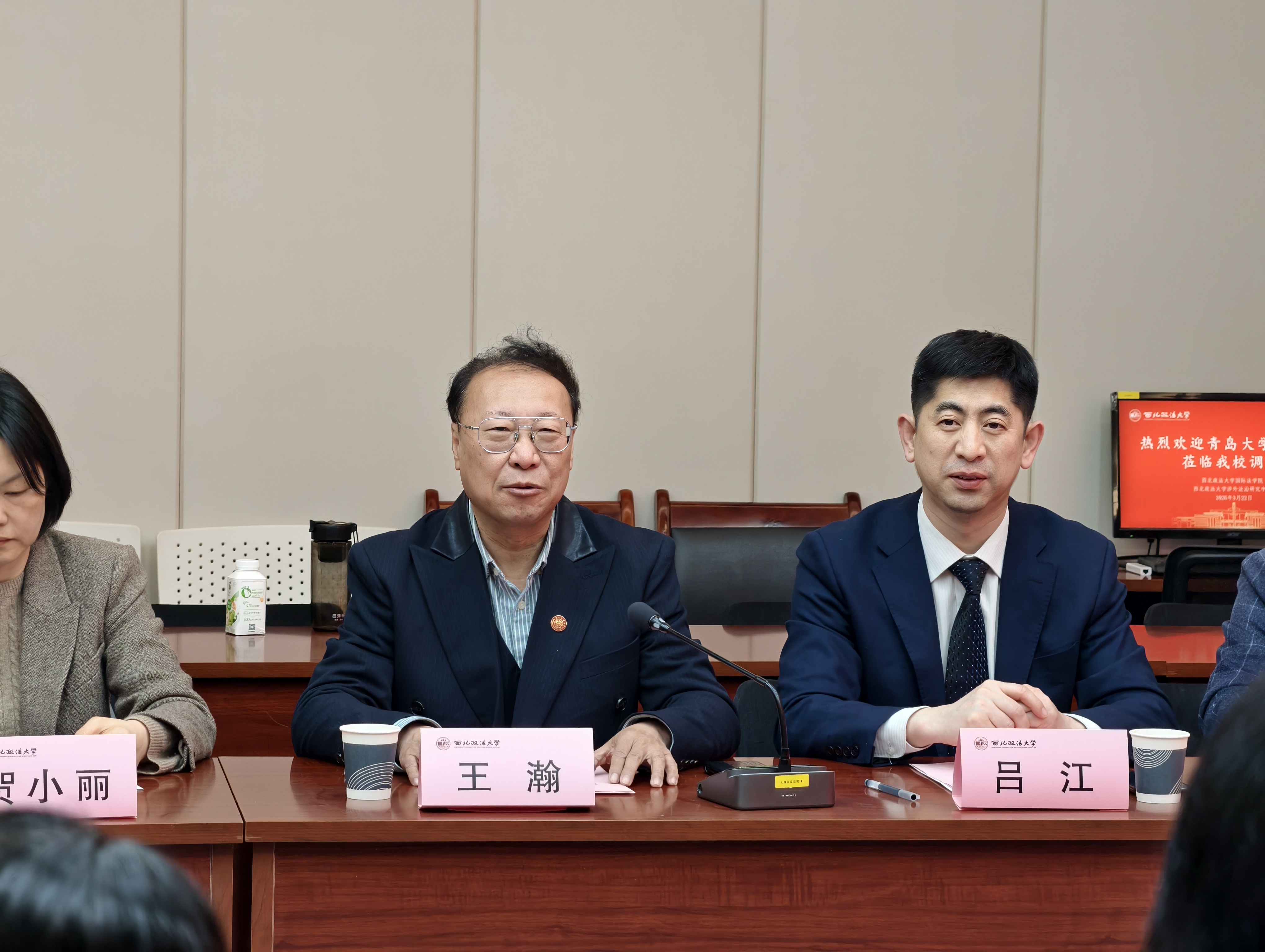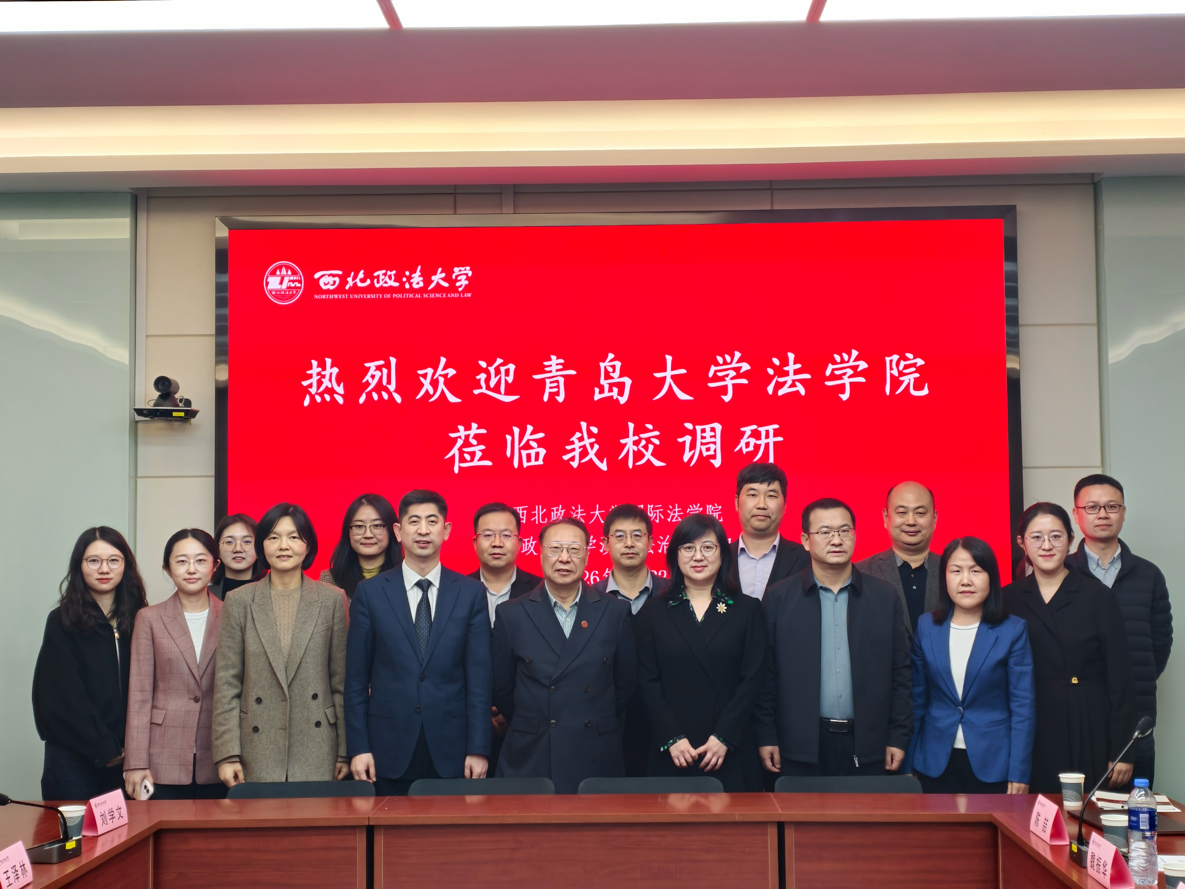 2026年3月22日,青岛大学法学院院长蔡颖雯一行到访西北政法大学,国家智库研究基地涉外法治研究中心执行主任王瀚教授、西北政法大学国际法学院副院长吕江教授、贺小丽副教授会见座谈,国际法学院王泽林教授、刘学文副教授、陈婉姝副教授、张光耀讲师参与座谈。座谈会由副院长吕江主持,双方围绕涉外法治人才培养、学科发展等议题深入探讨。