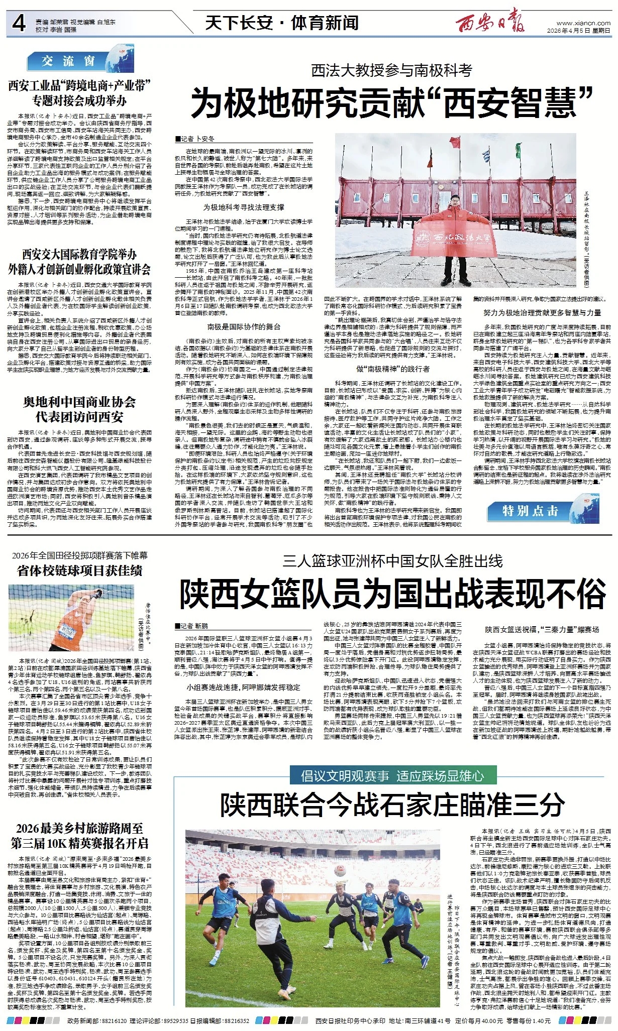 西安持续为极地研究注入力量、贡献智慧。近年来,来自西安电子科技大学、西安建筑科技大学、西北大学等高校的科研人员往返于西安与极地之间,在海量文献与皑皑冰川间寻找答案。极地建筑研究已成为西安建筑科技大学绿色建筑全国重点实验室的重点研究方向之一;西安工业大学青年学子成功研发“电磁曙光”智能救援系统,为极地救援提供了新的解决方案。